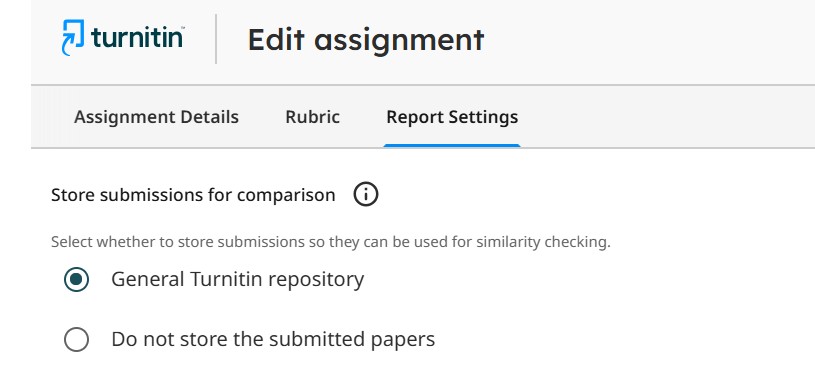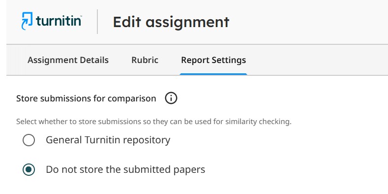 “Do not store the submitted papers” setting to ensure your submit paper will not be stored in any Turnitin Repository.